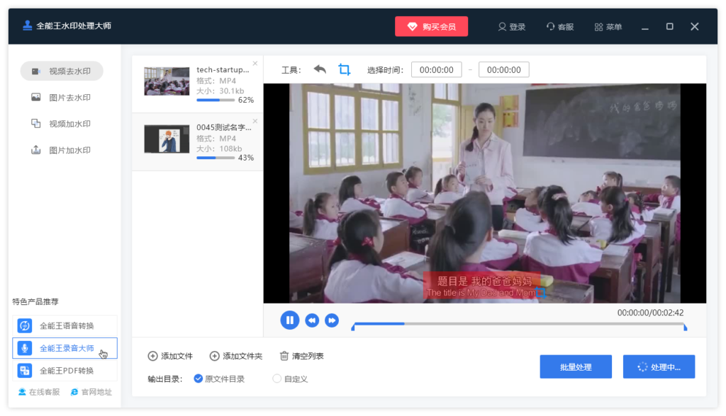 - 处理极速高效:多核并行渲染技术,在处理超清视频去水印任务时依然能保持流畅的进度反馈。