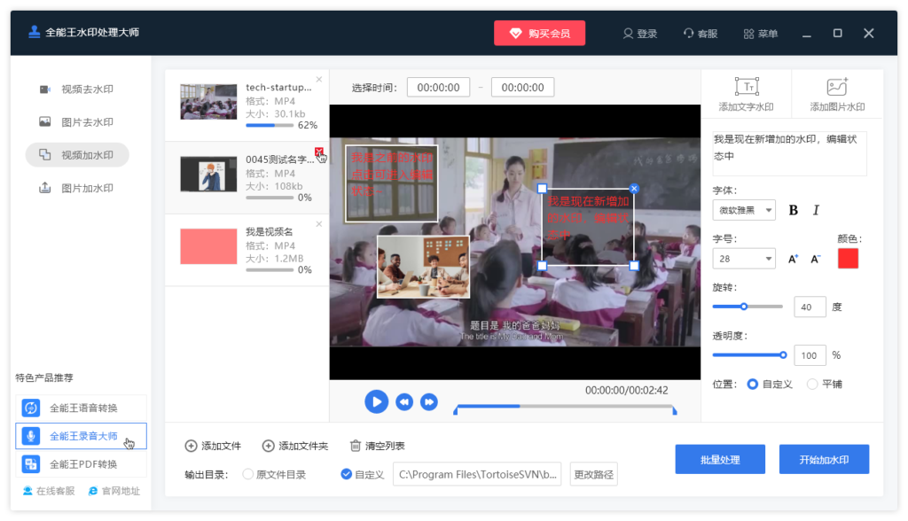 除了“去水印”,还支持为图片和视频批量添加自定义文字或图片防伪标识。支持多个位置同时叠加,助您快速保护原创作品的版权。