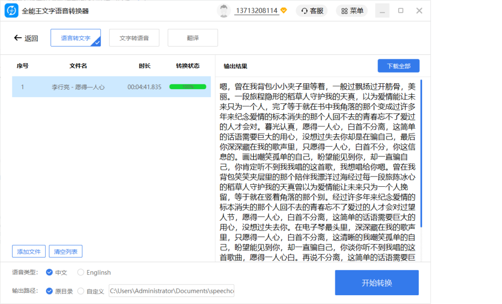 无论是制作短视频配音、商场广播,还是翻译外语素材,全能王都能提供精准的技术支持与多样化的输出选项。